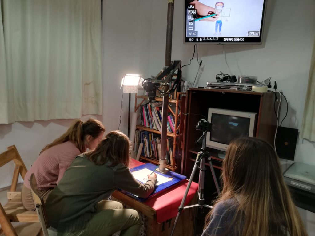 Cada uno en su tarea, con mucha concentración: algunos animan, otros sacan fotos. Con algún utensillo mueven mas fácilmente las diferentes piezas del personaje y a través del monitor van viendo como queda compuesto el cuadro frente a la cámara.